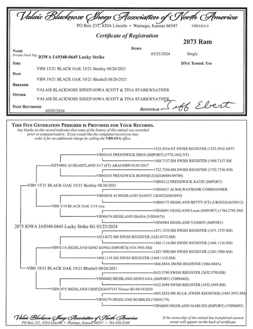- Progeny - Sire to the 4th Overall Purebred Ewe, Iowa Miss America, at the 2025 USA National Valais Blacknose Show and Grading.
