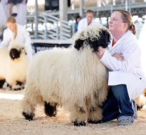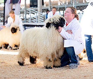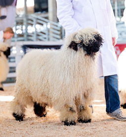 Highland Kitty, owned and shown by Valais Iowa, was the Grand Champion Purebred Ewe and Supreme Champion at the 2023 USA National Valais Blacknose Show and Grading.